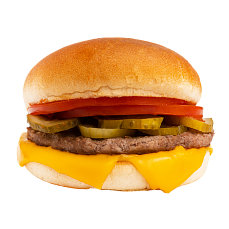 SБулочка, котлета говяжья, сыр чеддер, огурец, помидор, кетчуп.